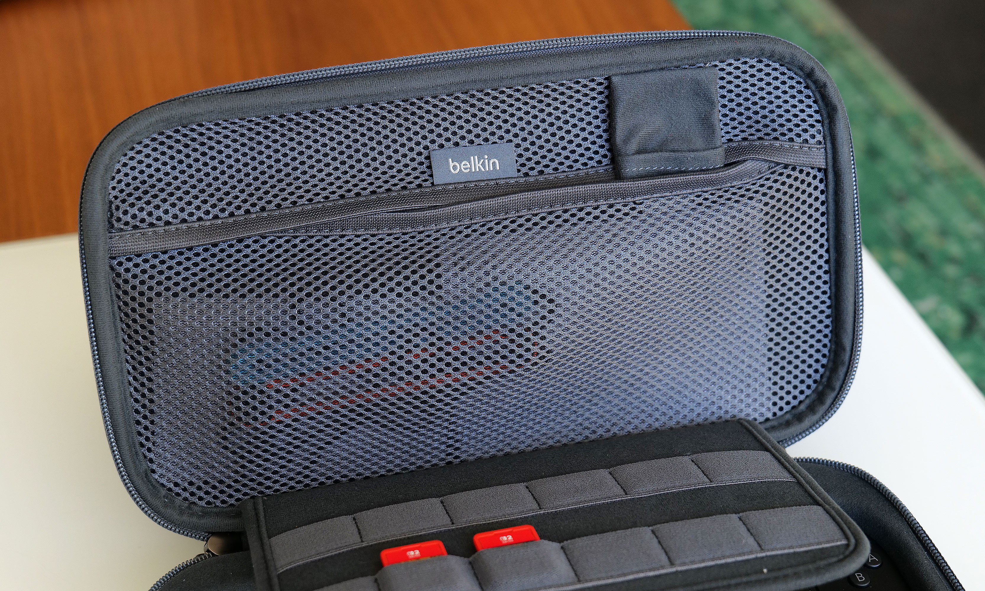 The inside of the Pro Charging Case features a handy mesh pocket, 12 slots for game carts and a hidden AirTag pouch. Sam Rutherford for Engadget Other small touches on Belkin's Pro Charging Case include a mesh pocket for storing things like cables, Joy-Con straps or cleaning cloths, which is very handy. However, my favorite thing might be the AirTag pouch that's also hidden inside that pocket, which could give you a fighting chance of recovering your system if it's ever lost or stolen (though I wouldn't count on it).